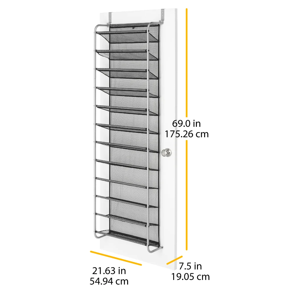 While using that dead space behind your door, Mainstay's 36-Pair Over-The-Door Shoe Organizer holds up to 36 pairs of shoes on display to easily find what you are looking for. The unique metal and tear-resistant mesh design optimize durability and functionality. The mesh-lined back prevents shoes from falling out while protecting the door from scuffs. The adjustable over-the-door hooks accommodate varying door sizes. This shoe rack is made to last, with strong yet breathable fabric and reinforced seams. These elegant shoe shelves are made of a high-quality metal frame with a Gunmetal finish that matches most décor styles. This shoe organizer offers the option to be permanently mounted to a door or wall. Some assembly is required with the tools included. Assembled Dimensions: 7.5 L x 21.63 W x 69.0 H inches.